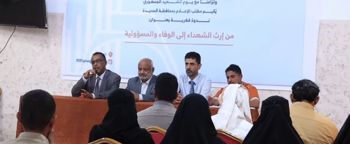 نظم مكتب الإعلام بمحافظة الحديدة، اليوم، ندوة فكرية بعنوان "من إرث الشهداء إلى الوفاء والمسؤولية"، إحياءً ليوم الشهيد الجمهوري الذي يصادف الرابع من ديسمبر.
