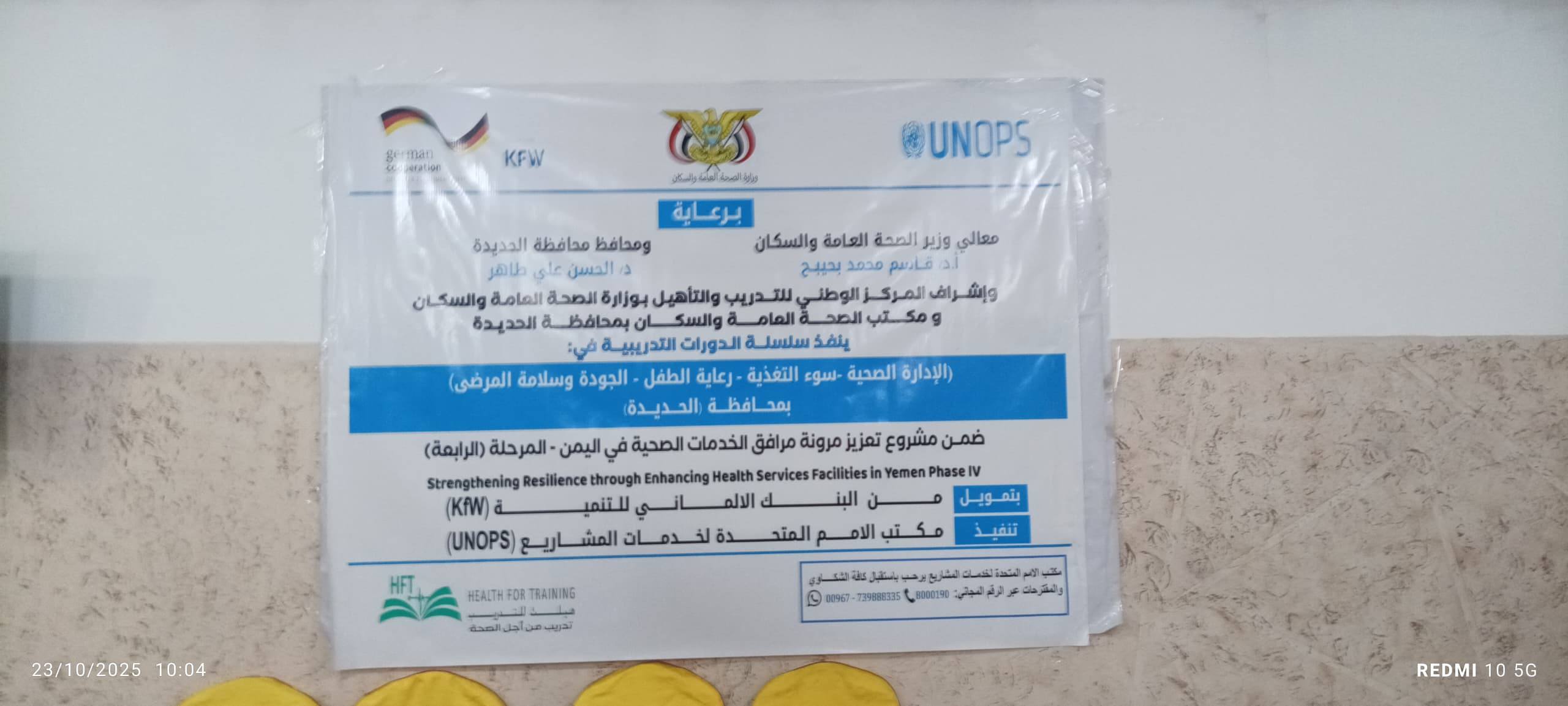 #إعلام_الحديدةدشن مدير عام مكتب الصحة بمحافظة الحديدة الدكتور علي الأهدل، اليوم، سلسلة من الدورات التدريبية التخصصية في مجالات الإدارة الصحية، وسوء التغذية، ورعاية الطفل، والجودة وسلامة المرضى، ضمن مشروع تعزيز