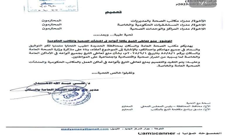 #إعلام_الحديدة أصدر مكتب الصحة بمحافظة الحديدة، اليوم، قرارا يقضي بمنع استخدام التبغ بكافة أشكاله داخل المكاتب الحكومية والمنشآت الصحية العامة والخاصة في المحافظة.جاء القرار، الذي وقعه مدير عام مكتب الصحة